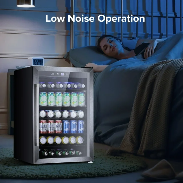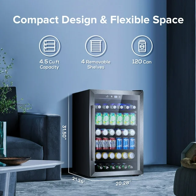 PERFECT CAPACITY:Auseo 4.4 Cu. Ft. The beverage Refrigerator features an elegant see-through, left hinge glass front door with a stainless steel frame for you to view your wine, beer, or soda at a glance. With its reinforced glass door with an airtight seal and help to maintain an ideal humidity level, this beverage refrigerator gives you a compact and modern design. Blue soft LED interior lighting not only beautifully showcases the wine or drink but also won't damage the wine or drink.