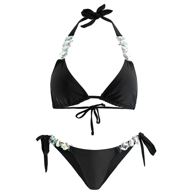 BIKINX Sexy Women's Swimsuit 2 Piece Black Bikini Sets Thong Bathing Suit for Women, Triangle Bikini, Rhinestone Bikini, Side Tie Bikini Bottom Swimwear