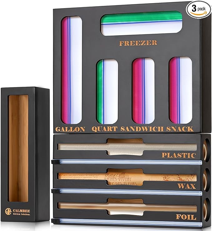 Calmbee Storage Bag Organizer, Foil and plastic wrap organizer with cutter, Kitchen Organizers and Storage Compatible with Gallon, Quart, Sandwich, Snack Bags and 12" Aluminum Foil & Wax Paper,Black
