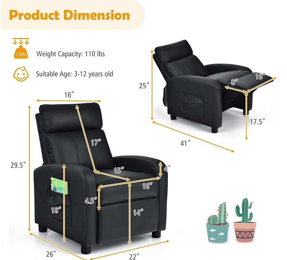 Costzon Kids Recliner, Adjustable PU Leather Lounge Chair w/Side Pockets, Footrest, Headrest for Kids Room & Play Room, Easy to Clean, Padded Recliner Sofa for Children Boys Girls Aged 3-12 (Black)