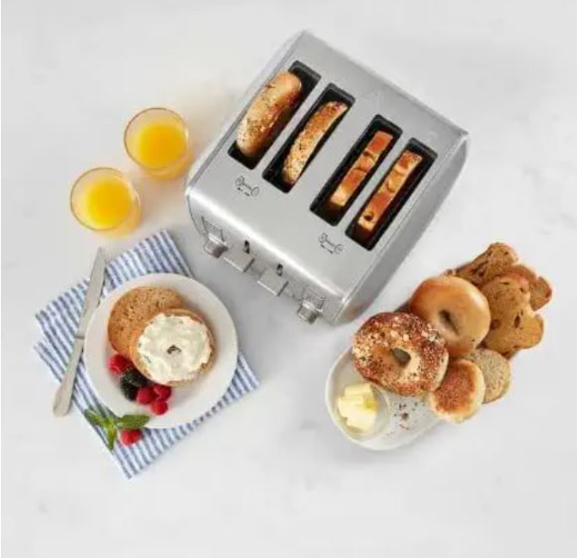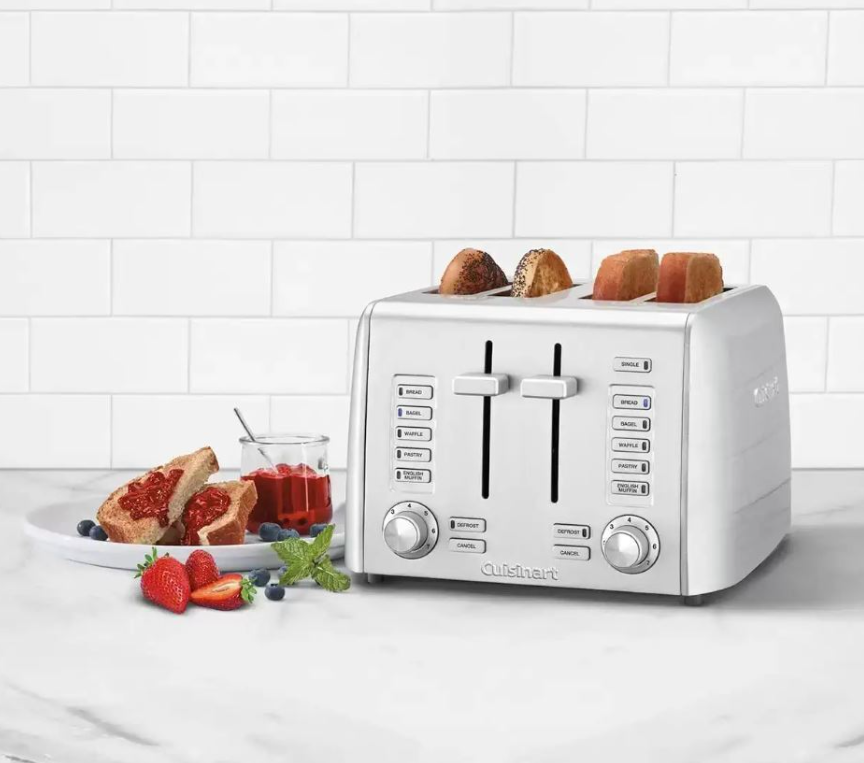 Function and fashion come together to deliver the best in style and performance. This sleek, stainless steel Cuisinart toaster is designed to accommodate all types of bread selections and shade preferences. Dual control panel with programmed settings for bread, bagels, English muffins, waffles, and toaster pastries Single Slice button adjusts heat to ensure both sides of a single slice are evenly toasted Self-adjusting toast slots to accommodate thick and thin items Custom defrost works in combination with bread type presets for accurate defrosting time Simple dial controls for 7 toast shade settings High-lift carriage for easy removal Crumb tray slides out for quick and easy cleanup Stainless steel classic, sleek styling.