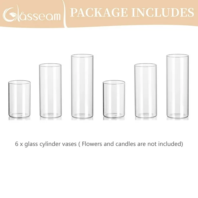 The package includes 6 glass cylinder vases of 3 different heights, 2 pcs each, flowers and candles are not included.