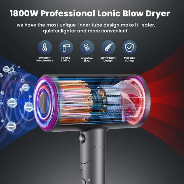 Innovative Durable & Low radiation Design -- Built with dust-free fan blades, the non-removable mesh back cover(wash free) prevents hair from getting sucked into the blow dryer. With Inner Cylinder Motor - Innovative technology for noise reduction, explosion-proof and low radiation: reduce more electromagnetic field radiation than similar hair dryers, which makes our dryer safer and more reliable, suitable for old and young people to do a professional hair salon at home.