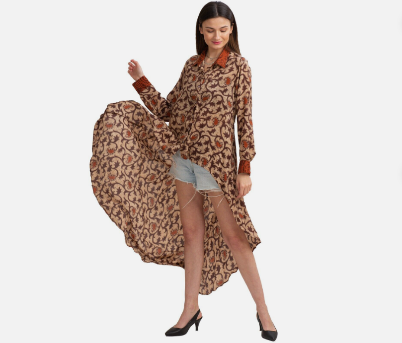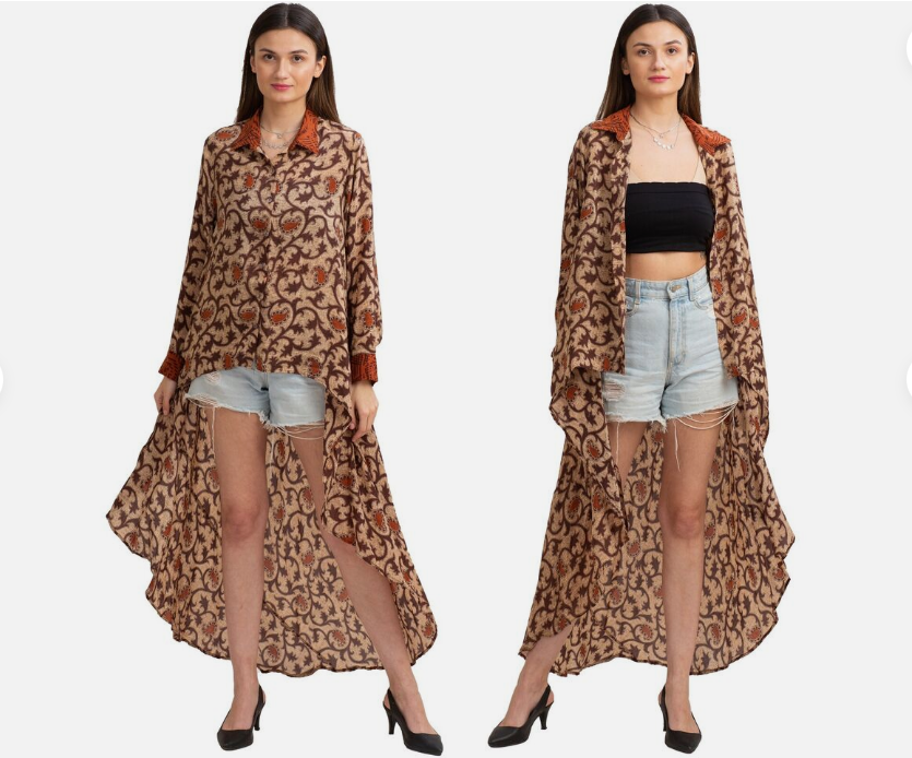This upcycled shirtdress is a versatile and sustainable piece of clothing. It has been given a new life from repurposed materials and transformed into a chic and fashionable dress. The high low hemline adds a trendy touch, making it perfect for any occasion. The shirtdress style is timeless and classic, with a button-up front and collar. By choosing an upcycled shirtdress like this, you're not only reducing waste but also making a unique and eco-friendly fashion choice.