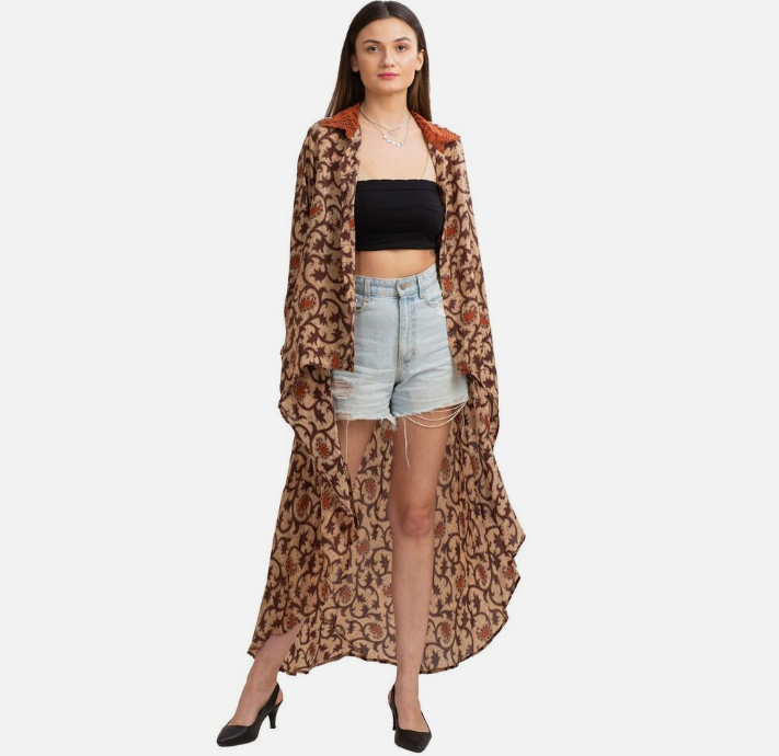 3: This outfit has been upcycled from a vintage silk saree, sourced from Sanskriti Vintage's own store. Fabric used: Printed Pure Crepe Silk