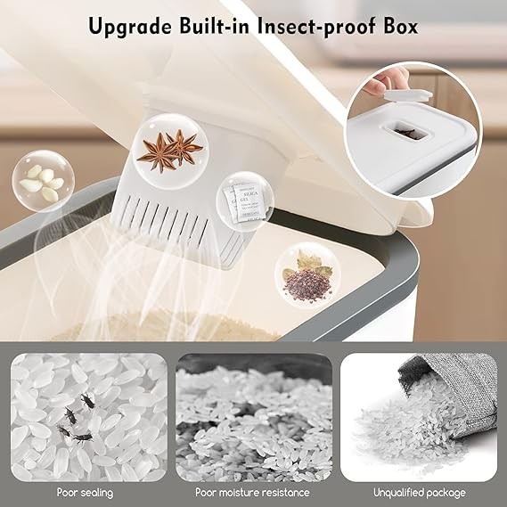 【Upgraded with Built-in Fresh Box】 The rice dispenser with a built-in fresh box, in order to keep your food safe from moisture and any pest, you can put some star anise, garlic, cloves, bay leaves, and desiccant in the proof fresh box of the rice storage container, so that you can enjoy natural fresh rice every day.